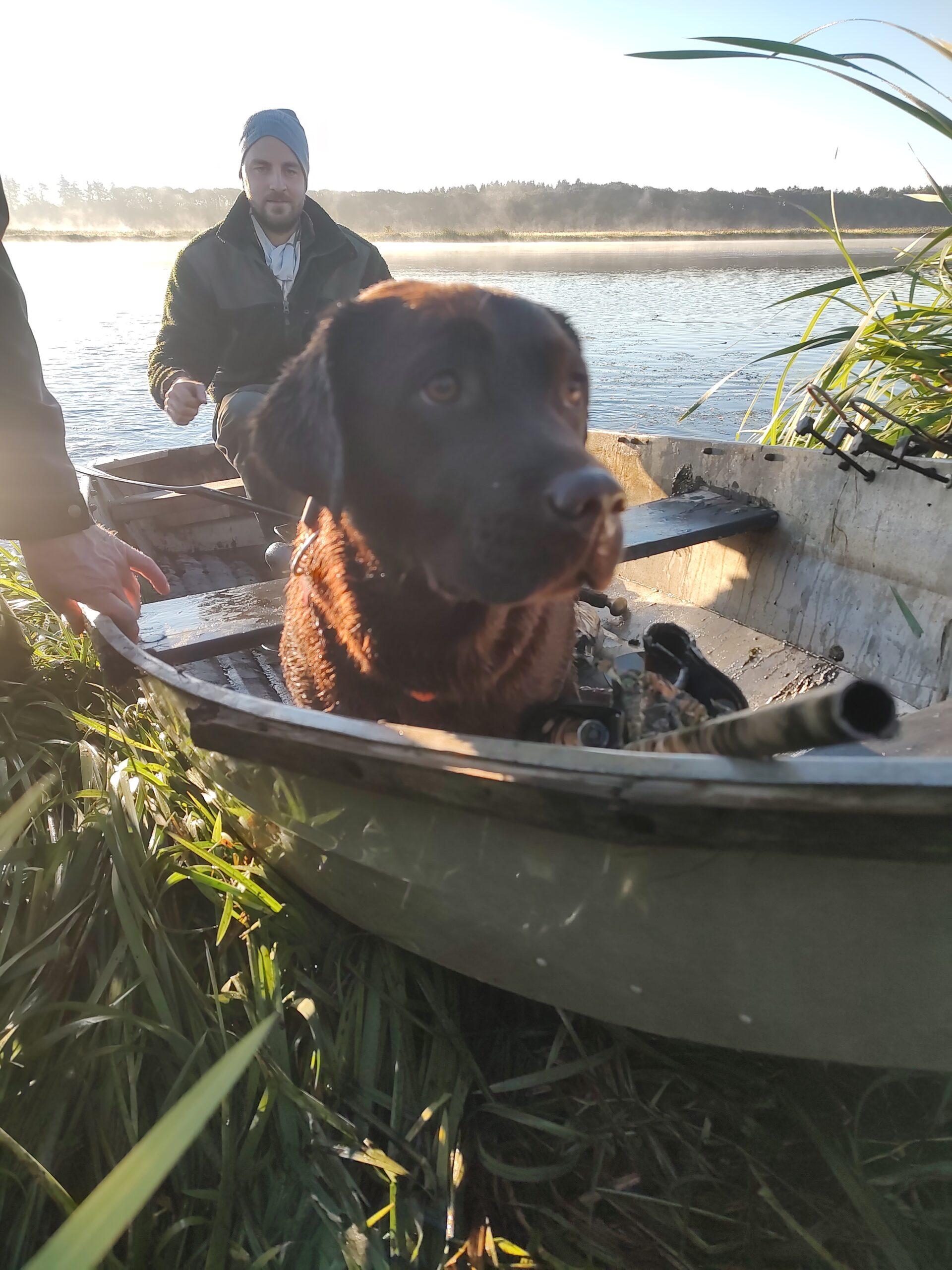 På Klockan 04.00 stod vi, fyra förväntansfulla jägare och en ännu ivrigare labrador, vid ovannämnda jolle. Så, med pannlampor på, lastades jägare, jakthundar och bulvaner i båten och turen gick 150 meter ut till en liten ö som ligger mitt i sjön.