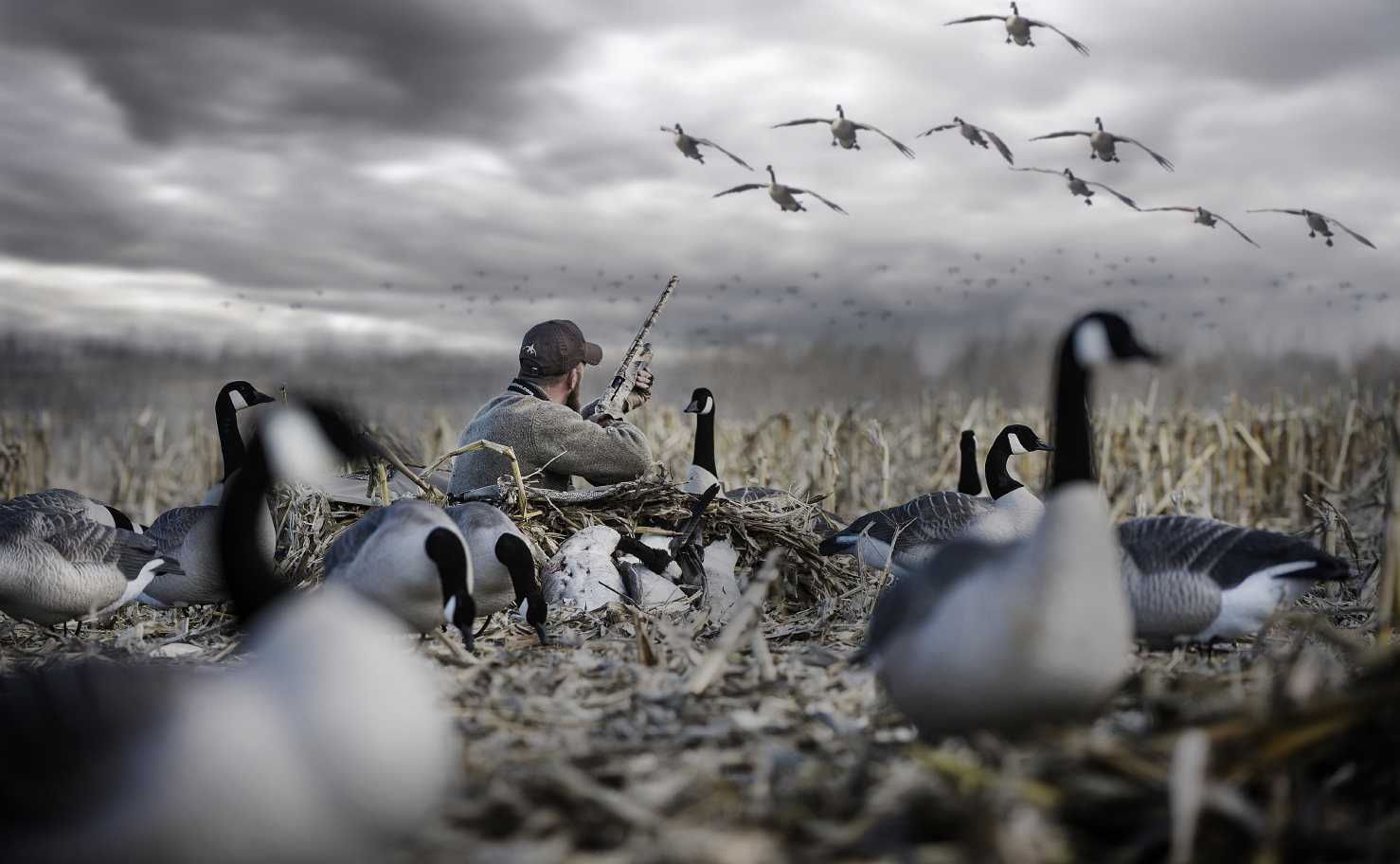 Den lilla flocken av grågäss vänder sig om och går upp för vinden för tredje gången. Våra gömslen är undanstoppade i de höga vetestubbarna och framför oss och mellan oss står en större flock blandade skal och full body gås. De rör sig lätt i vinden och ser ut som en flock förorenande och vilande fåglar på ett stubfält. Gässen pratar och jag lyssnar noga på deras ljud och talar med få avvikelser genomgående samma språk i mitt gås lockpipa. Jag studerar  reaktion och anpassar min kallelse därefter. De stora fåglarna vänder och går ner i höjd och är nu samtidigt på väg rakt mot zonen i bulvan formationen, där vi har gjort en stor inflygnings- och landningsplats tidigt på morgonen. Det noggrant utvalda området i vår inställning, som vi vill att fåglarna ska styra mot och förbereda för landning över, och som kommer att ge oss 4, glada jägare den mest optimala möjligheten att leverera en dödsskott gäss på en kort och sund skjutbana. Nu är gässen så nära att vi tydligt kan se hur de vänder huvudet från sida till sida för att ta reda på om det är säkert att gå ner.