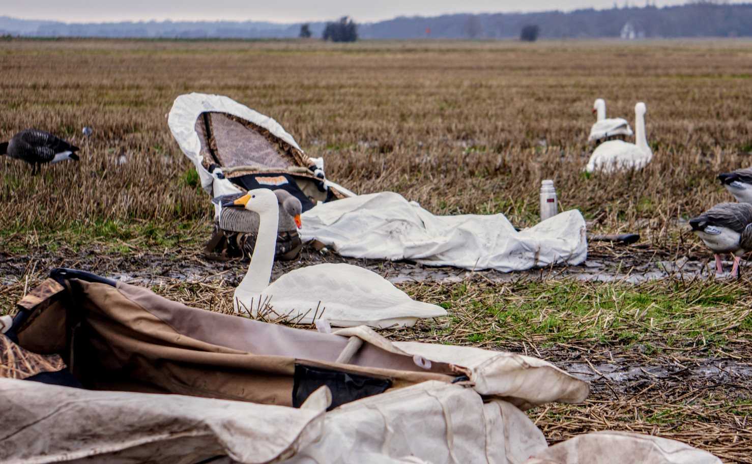 De tål några stötar, kan packas direkt i påsen och är också UV-skyddade. Köp gärna en bra blandning av skal som ser ut som gäss som ligger och fullgås som representerar stående, aktiva gäss. Ju mer olika kropps- och huvudpositioner du har i besättningen, desto närmare kommer du något som liknar en levande gås. De flesta nyare lockgäss är gjorda så att de kan röra sig i vinden. Rörelse i bulvaner är väldigt viktigt och gör skillnad i fråga om gässen ser flocken och reagerar positivt eller om de bara flyger förbi. På dagar med rätt vindförhållanden (3-10 m/s) kan det vara mycket effektivt att blanda exempelvis Sillosocks (vindkuddar) i flocken. På vindlösa dagar är det en bra idé att ha en gåsflagga som hjälper dig att uppmärksamma rätt tider. I de områden där gässen foder tillsammans med de många svanar som anländer till DK i början av november använder jag alltid så många lock svanar  som möjligt. Svanarna är en fantastisk blickfångare samtidigt som gässen likställs med fred och mat. Dessutom är det enkelt att blanda sina gömslen med vita snötäcken i en flock lockfåglar med många svanar.