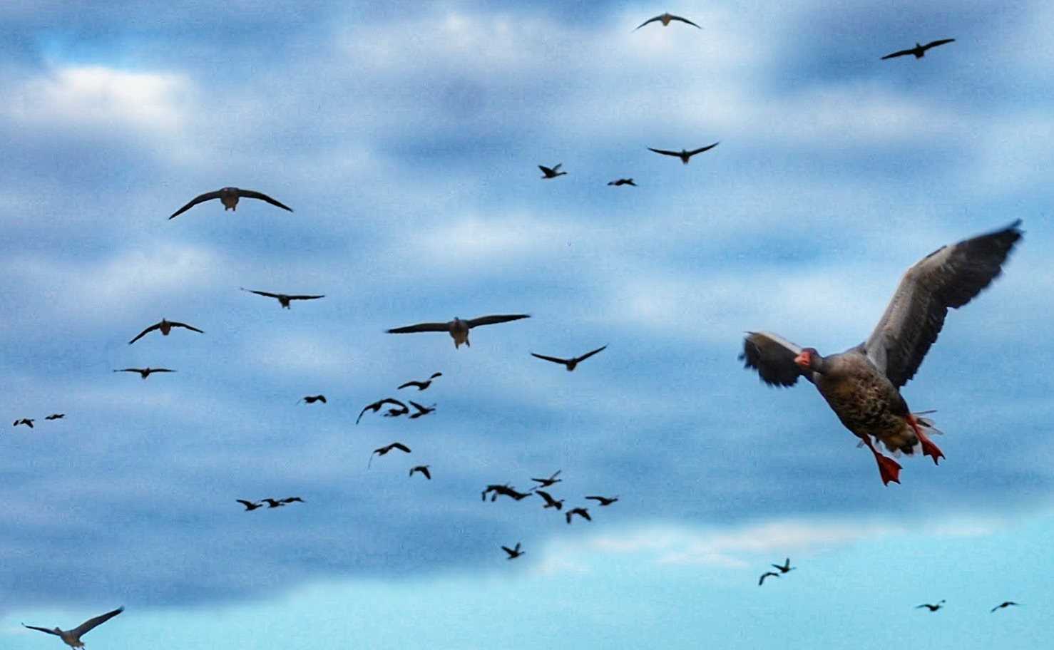 I gömslen håller vi andan, adrenalinet pumpar runt venerna och spänningen är nästan omänsklig. Alla är 100% procent fokuserade på att ligga helt stilla, och sanningens ögonblick är bara delad sekund borta. Då går det fel ändå! Eftersom gässen är 30 meter bort känner den främre gåsen att något är fel och avger ett skrik av ångest. I nästa nu hör vi en hel kör av detta karakteristiska ljud från de flydande gässen och samtidigt det lika karakteristiska ljudet av gässens yttre svängfjädrar när de drar bakåt och bort. När gässen har försvunnit kommer vi upp i sittande ställning, andas ut, ler bredt mot varandra, släpper ut och går ut framför vår setup för att ta reda på vad som fick gässen att lämna platsen.