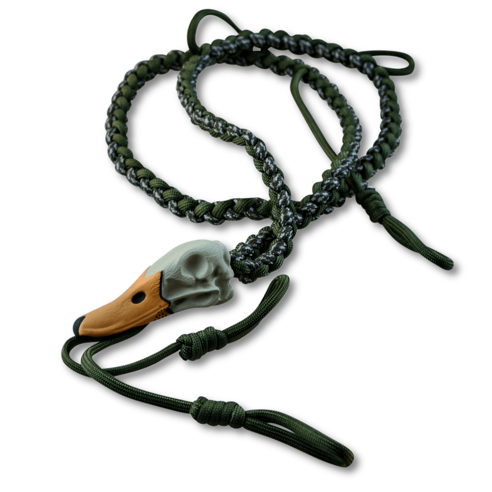 Avian-X kvalitets lanyard med handsvetsad snodd och med en mini and skalle. Avian-X Deadhead Call Lanyard innehåller 4 slingor, där du kan bära dina lockpipor säkert och med stil.