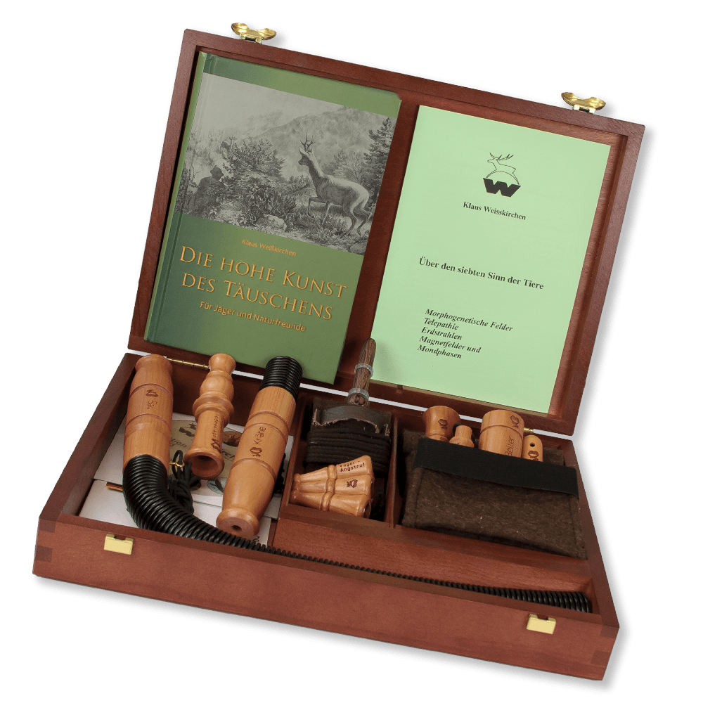 Lockpipor från Klaus Weisskirchen  i Premium Box för jakt på rådjur, räv, kråka och vildsvin. Den exklusiva trälåda med lockpipor och DVD från tyska Klaus Weisskirchen. Den ultimata gåvan för jägaren, som uppskattar konsthantverk och kvalitet.