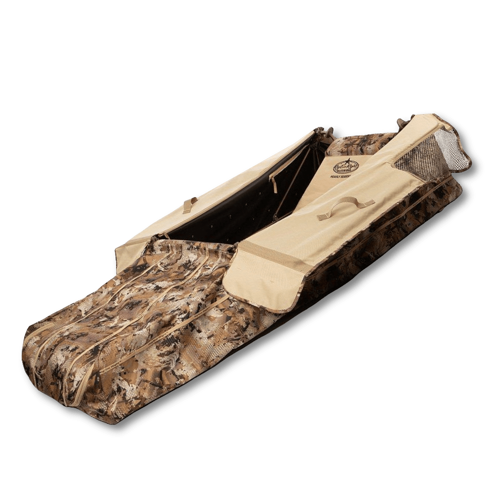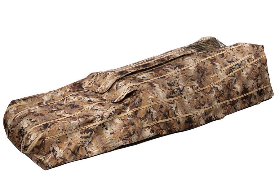 Gömslen har ett fint vadderat ryggstöd och nackstöd, så din gåsjakt blir extremt bekväm och den rymliga interiören ger dig rörlighet och gott om förvaringsutrymme. Det finns naturligtvis hål för användning av gåsflaggor och en dragkedja i fotänden för enkel rengöring.